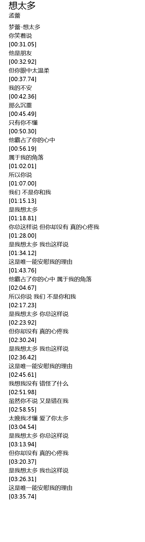 | [00:03.12] | mèng lěi xiǎng tài duō |