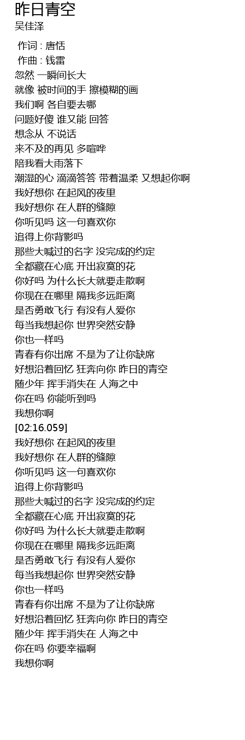 | [03:20.999] | 好想沿着回忆 狂奔向你 昨日的青空 |