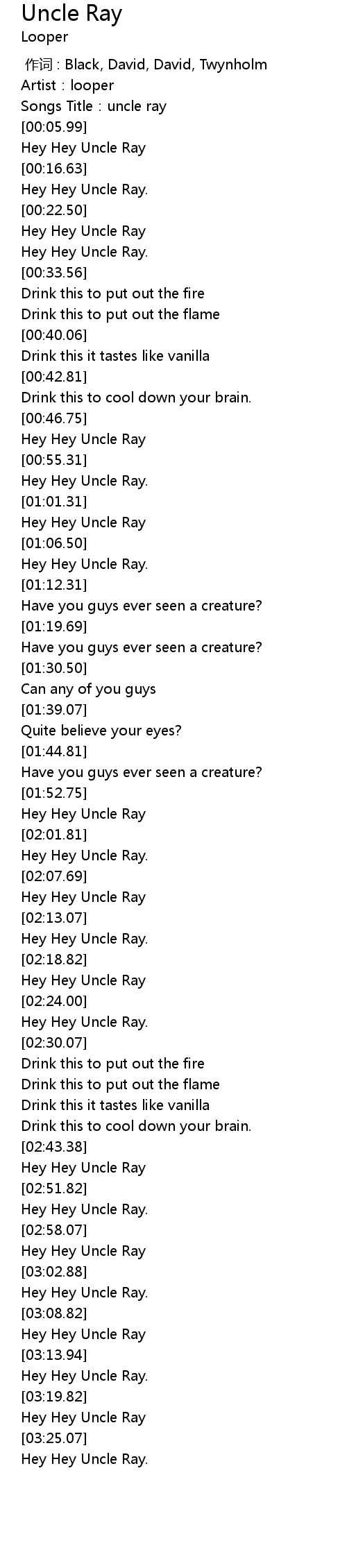 | [01:57.88] | Hey Hey Uncle Ray |