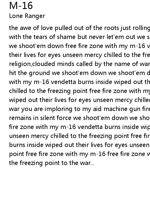 the awe of love pulled out of the roots just rolling thunder we found pregnant with the tears of shame but never let'em out we shoot'em down we shoot'em down we shoot'em down free fire zone with my m-16 vendetta burns inside wiped out their lives for eyes unseen mercy chilled to the freezing point to the war blind religion,clouded minds called by the name of war 223 body penetration before you hit the ground we shoot'em down we shoot'em down we shoot'em down free fire zone with my m-16 vendetta burns inside wiped out their lives for eyes unseen mercy chilled to the freezing point free fire zone with my m-16 vendetta burns inside wiped out their lives for eyes unseen mercy chilled to the freezing point to the war you are imploring to my aid machine gun fire scorn life corroded from inside remains in silent force we shoot'em down we shoot'em down we shoot'em down free fire zone with my m-16 vendetta burns inside wiped out their lives for eyes unseen mercy chilled to the freezing point free fire zone with my m-16 vendetta burns inside wiped out their lives for eyes unseen mercy chilled to the freezing point free fire zone with my m-16 free fire zone with my m-16 mercy chilled to the freezing point to the war... |
