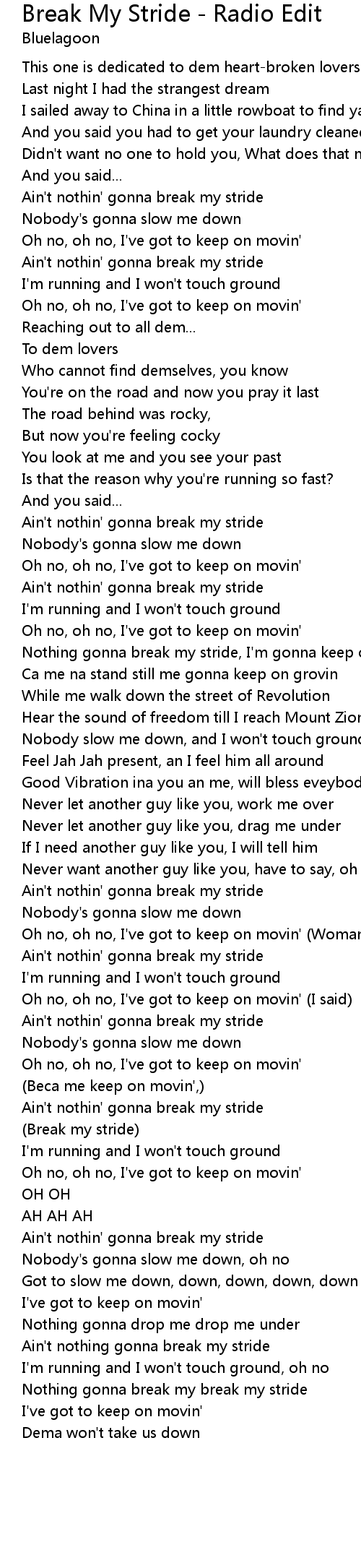 Nothing gonna break my stride, I'm gonna keep on movin' |