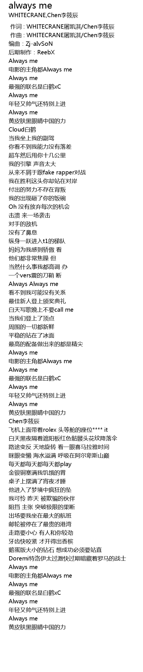 | [00:00.419] | 作曲 : WHITECRANE屠凯淇/Chen李筱辰 |