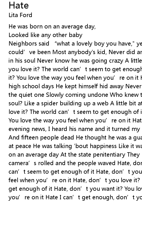 | Neighbors said “what a lovely boy you have," yeah Through the years he could’ve been Most anybody's kid, Never did anything to show The madman living in his soul Never know he was going crazy A little bit at a time. Hate, don’t you love it? The world can’t seem to get enough of it Hate, don’t you want it? You love the way you feel when you’re on it Hate, hate. All through his high school days He kept himself hid away Never let anybody close He was just the quiet one Slowly coming undone Who knew there was something missing from his soul? Like a spider building up a web A little bit at a time Hate, don’t you love it? The world can’t seem to get enough of it Hate, don’t you want it? You love the way you feel when you’re on it Hate, hate. Last night on the evening news, I heard his name and it turned my head Something 'bout a local boy And fifteen people dead He thought he was a guardian angel Gonna put this world at peace He was talking 'bout happiness Like it was some kind of disease He died on an average day At the state penitentiary They laid him in his grave The camera’s rolled and the people waved Hate, don’t you love it? The world can’t seem to get enough of it Hate, don’t you want it? You love the way you feel when you’re on it Hate, don’t you love it? The world can’t seem to get enough of it Hate, don’t you want it? You love the way you feel when you’re on it Hate I can’t get enough, don’t you love it? Hate! |