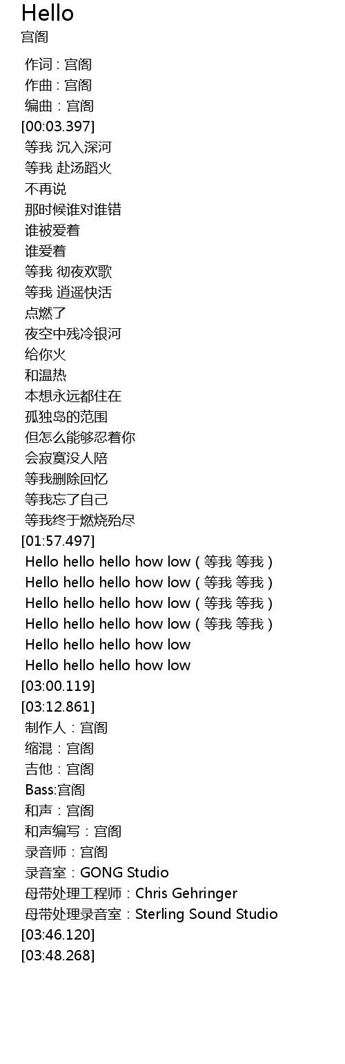 | [02:09.216] | Hello hello hello how low(等我 等我) |