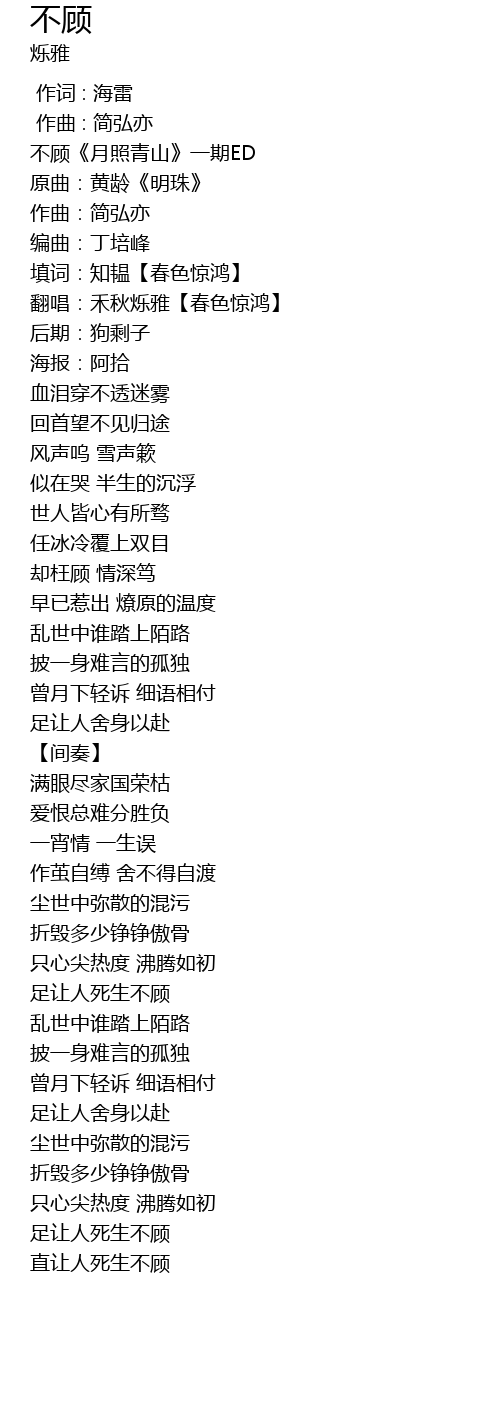 | Album | 广播剧《月照青山》一期ED 《不顾》 |