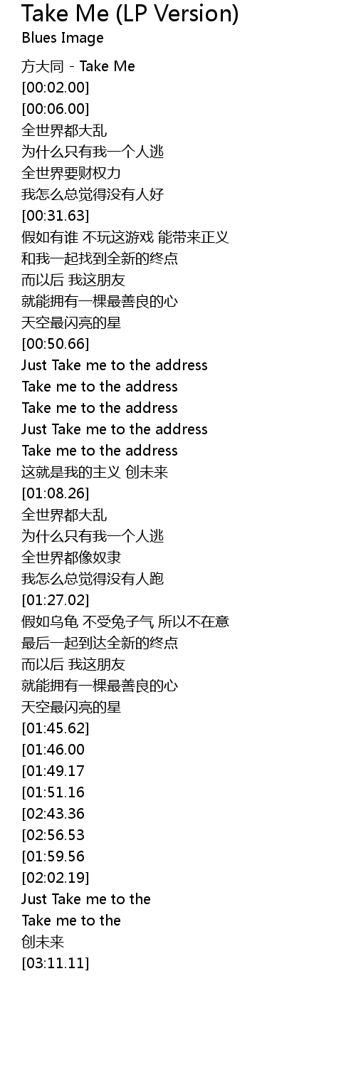 | [02:54.12][02:43.36][01:54.96] | Just Take me to the address |