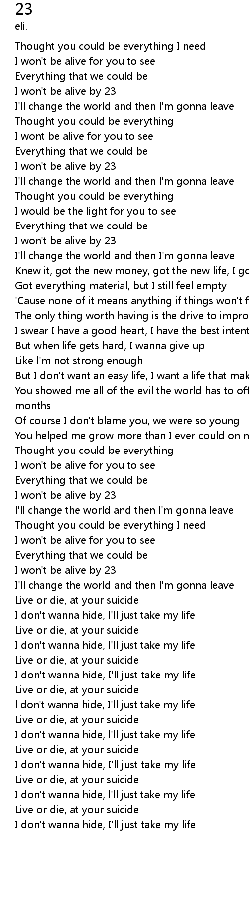 | [02:10.904] | I won' t be alive by 23 |
