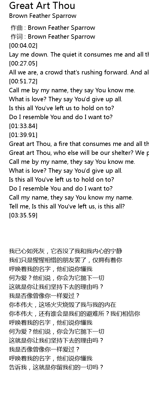 | [01:52.36] | Great art Thou, a fire that consumes me and all that lies within. |