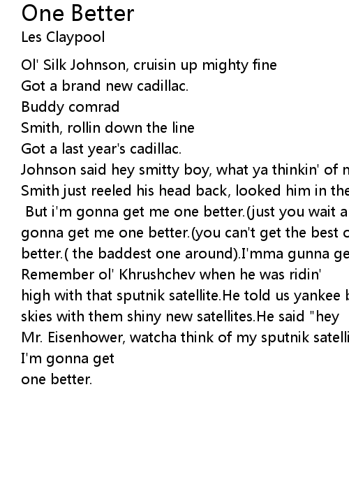 Smith just reeled his head back, looked him in the eye, "that's a mighty fine cadillac.[chorus] But i'm gonna get me one better.(just you wait and see).I'mma gonna get me one better.(you can't get the best of me).I'mma gonna get me one better.( the baddest one around).I'mma gunna get me one better.( 'cause' i got the biggest balls in town).[chorus]Remember ol' Khrushchev when he was ridin' high with that sputnik satellite.He told us yankee boys, he's gunna fill the skies with them shiny new satellites.He said "hey