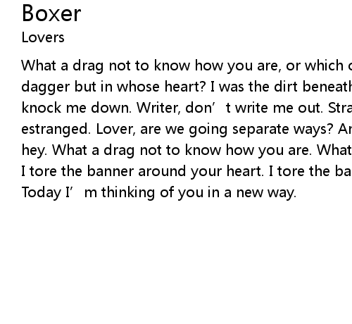 | What a drag not to know how you are, or which of us got the raw deal. I was a dagger but in whose heart? I was the dirt beneath whose wheel? Boxer, don' t knock me down. Writer, don' t write me out. Stranger, let' s not stay estranged. Lover, are we going separate ways? And don' t I get a say? Hey, hey, hey. What a drag not to know how you are. What a drag not to know how you feel. I tore the banner around your heart. I tore the banner that said " ideal." Today I' m thinking of you in a new way. |