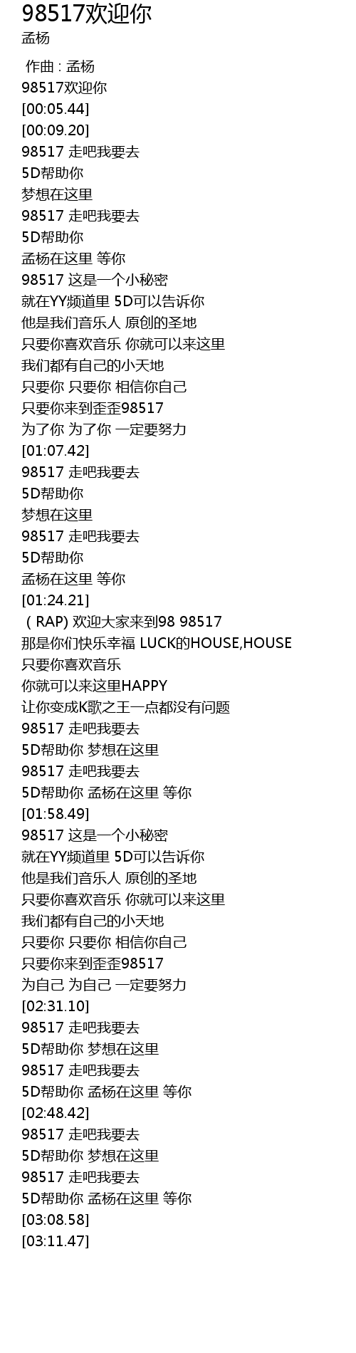 | [03:01.90] | 5D帮助你 孟杨在这里 等你 |