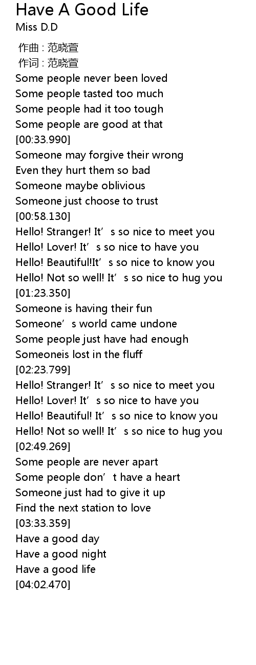 | [02:25.329] | Hello! Stranger! It' s so nice to meet you |