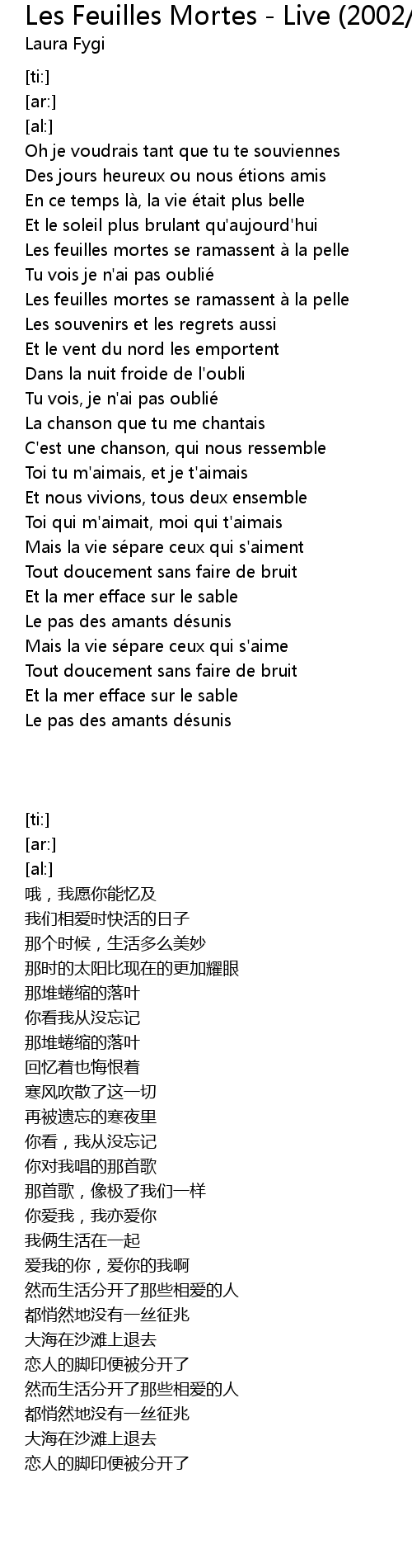 | [00:19.10] | Les feuilles mortes se ramassent a la pelle |