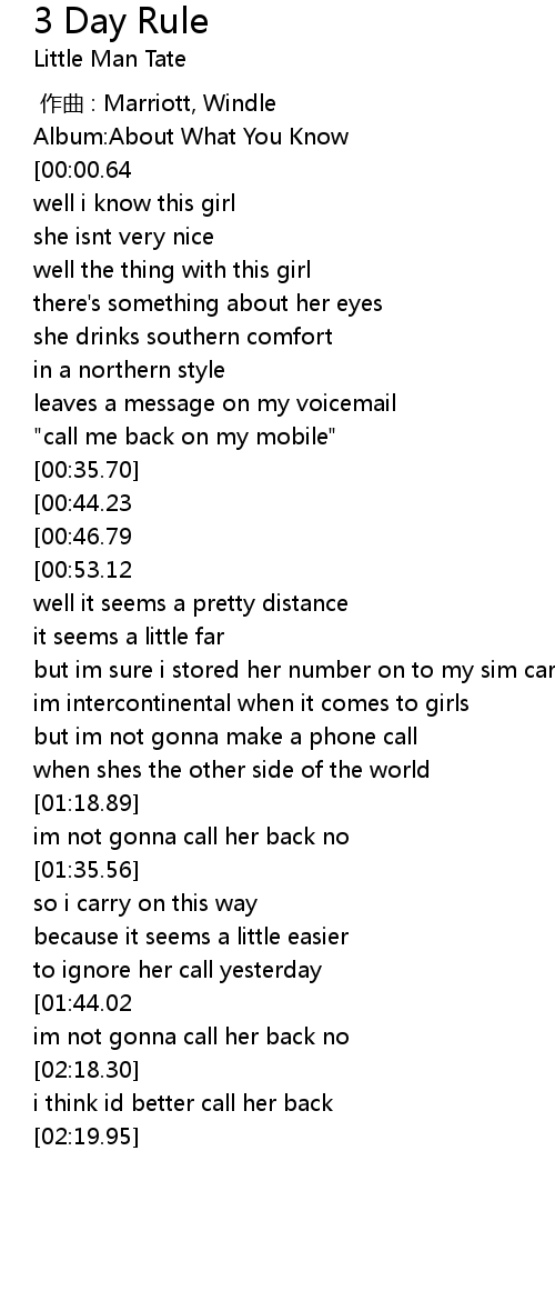 | [00:48.50][00:44.23][00:36.30] | im not gonna call her back no |