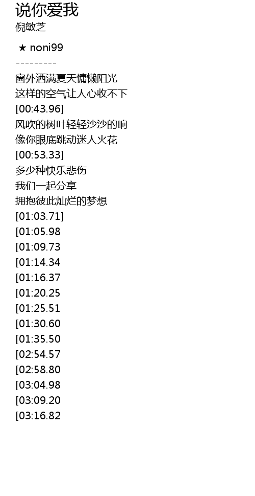 | [03:20.65][02:54.57][01:36.84] | shuo ba shuo ni xiang wo ba |