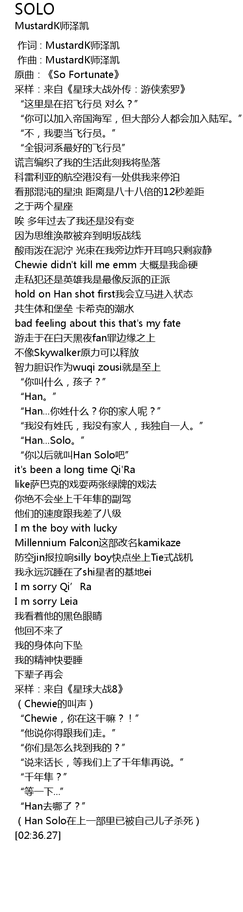 | [00:05.42] | 采样:来自《星球大战外传:游侠索罗》 |