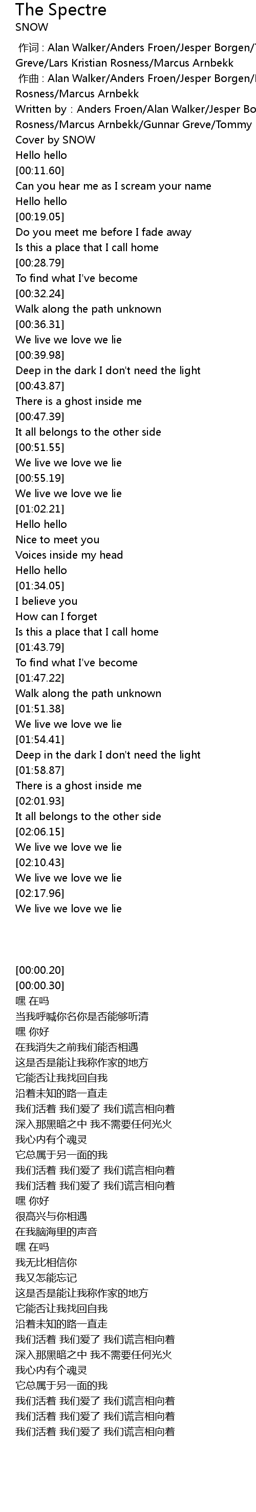 | [00:00.20] | Written by: Anders Froen Alan Walker Jesper Borgen Lars Kristian Rosness Marcus Arnbekk Gunnar Greve Tommy LaVerdi |