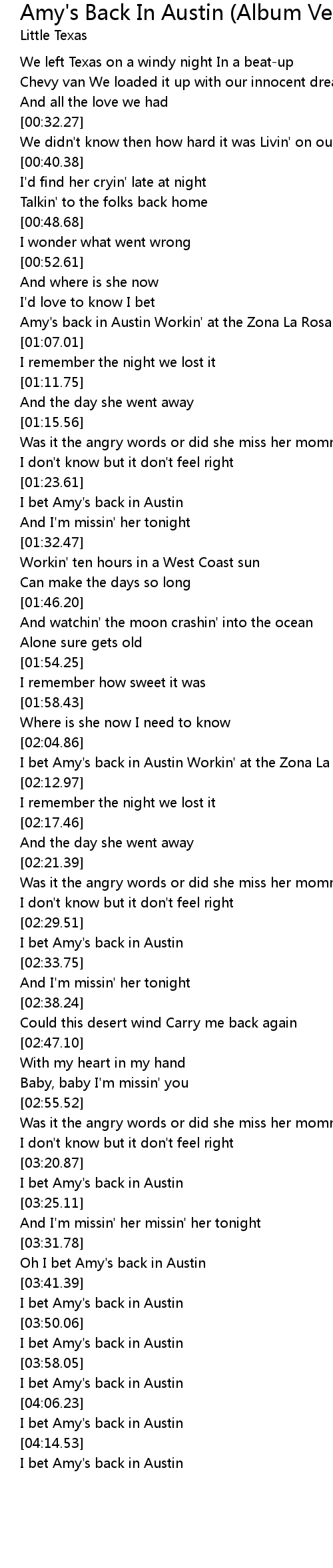 I bet Amy's back in Austin Workin' at the Zona La Rosa Cafe |