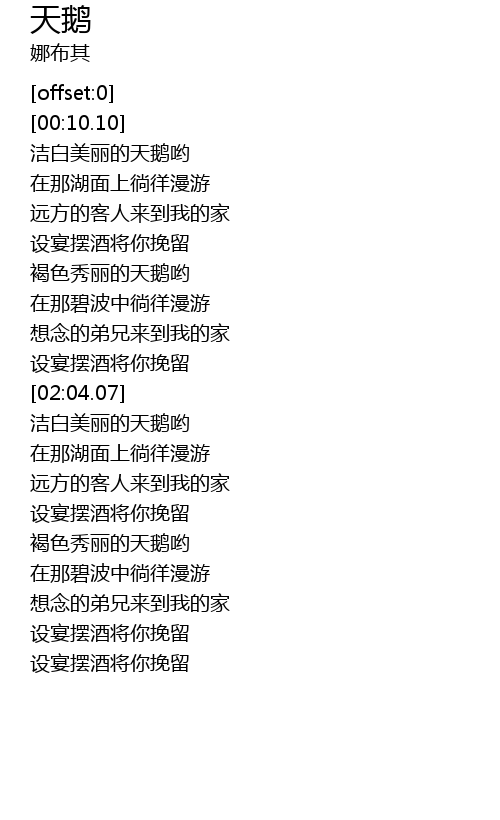 | [02:21.21] | 洁白美丽的天鹅哟 |