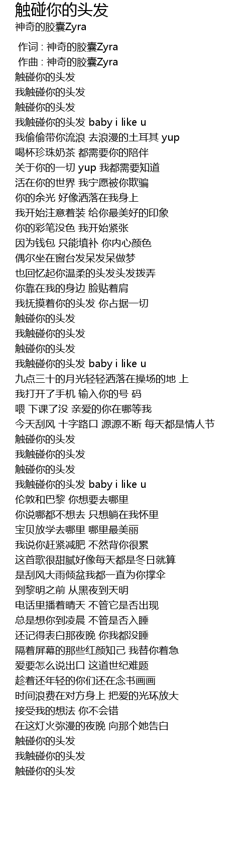 | [00:29.064] | 我触碰你的头发 baby i like u |