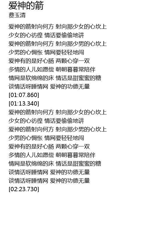 | [00:23.130] | 爱神的箭射向何方 射向那少男的心坎上 |