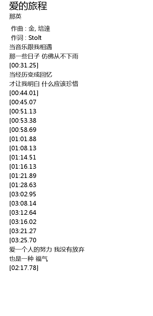 | [03:32.59][03:02.95][01:29.26] | 经过风雨 人生有多少旋律 |