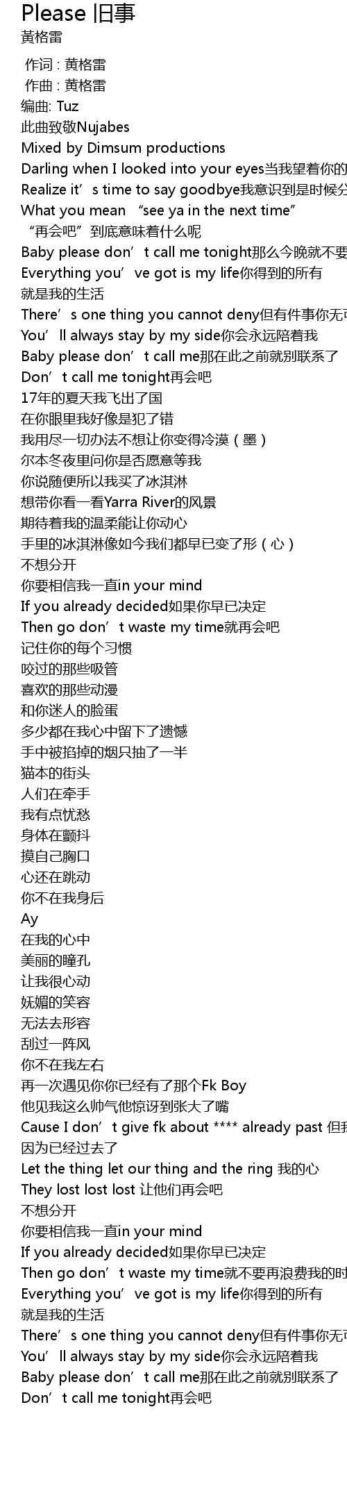 | [02:24.306] | Baby please don' t call me na zai ci zhi qian jiu bie lian xi le |