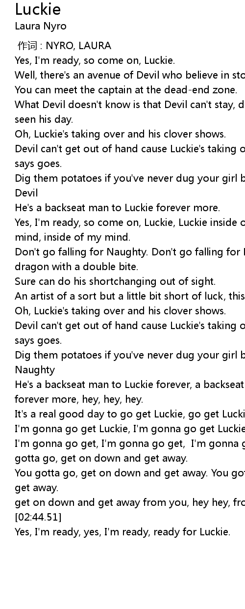 | [02:45.05] | Yes, I'm ready, yes, I'm ready, ready for Luckie. |