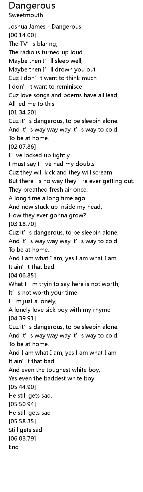 | [01:41.88] | Cuz it’s dangerous, to be sleepin alone. |