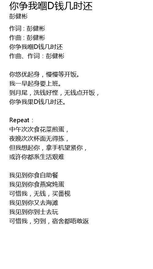 | 到月尾,洗钱好悭,无钱点开饭, | |