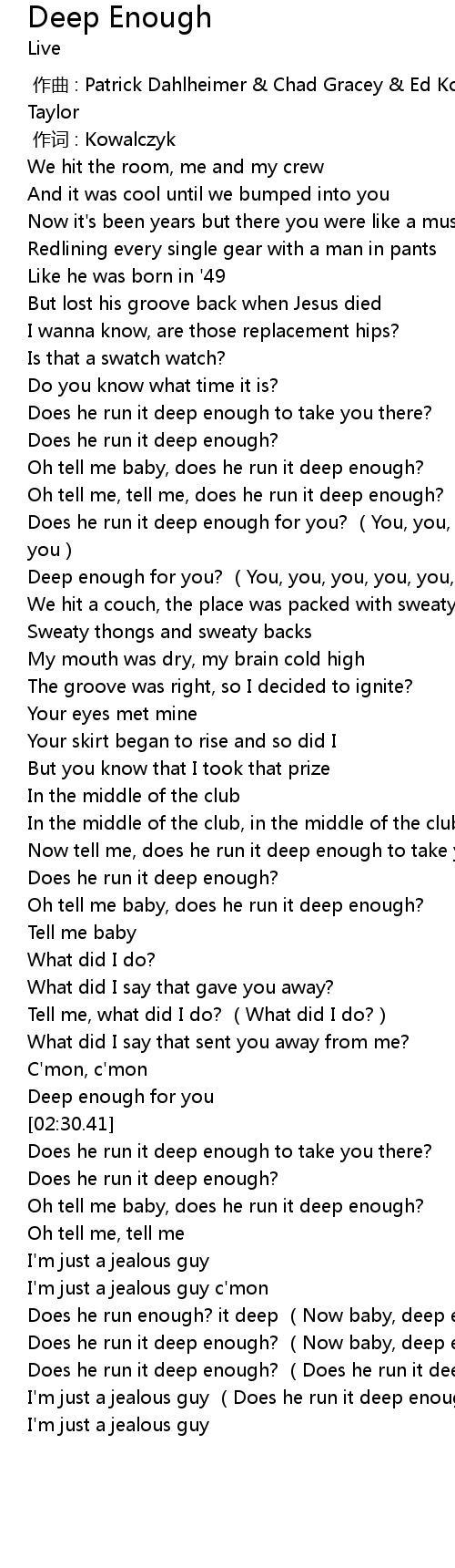 | [02:54.82] | Does he run enough? it deep Now baby, deep enough for you |