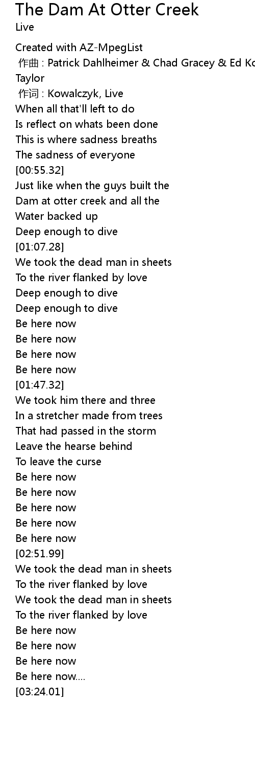 | [00:00.00] | zuò qǔ : Patrick Dahlheimer Chad Gracey Ed Kowalczyk Chad Taylor |