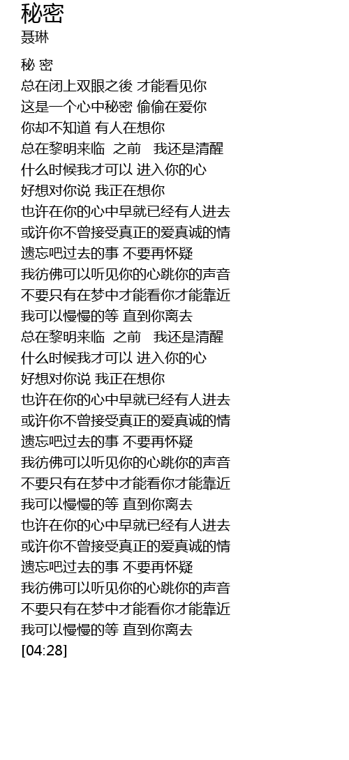| [00:22] | 这是一个心中秘密 偷偷在爱你 |