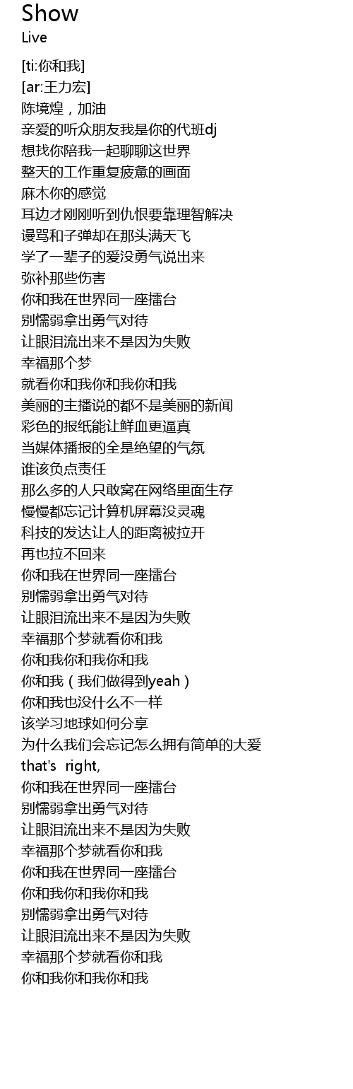 | [03:26.927] | ni he wo zai shi jie tong yi zuo lei tai |