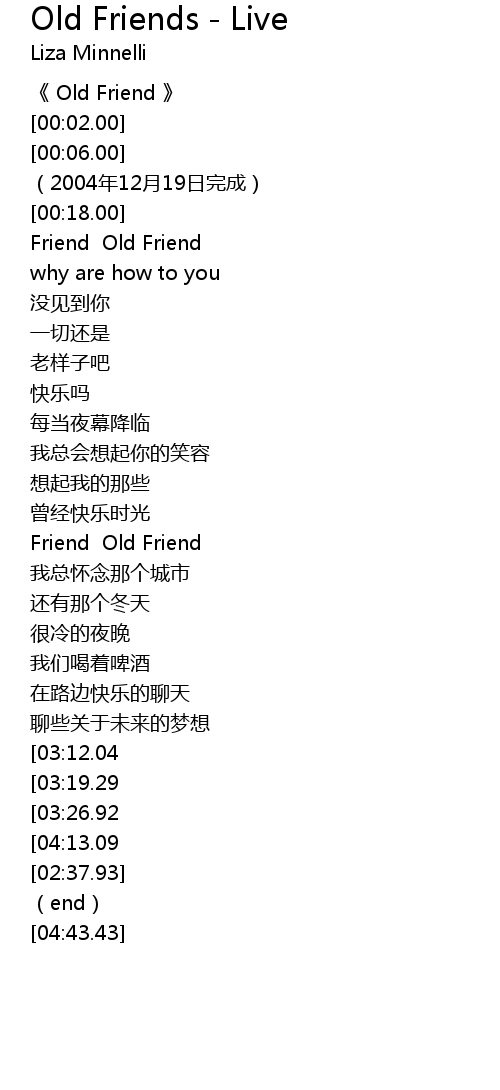 | [03:50.18][03:12.04][02:02.32] | Friend Old Friend |