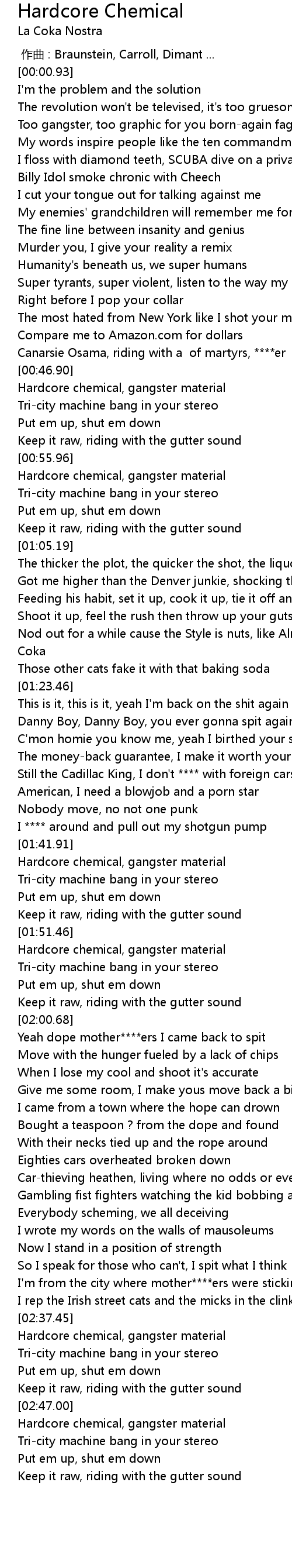 | [00:13.87] | Too gangster, too graphic for you born-again faggots |