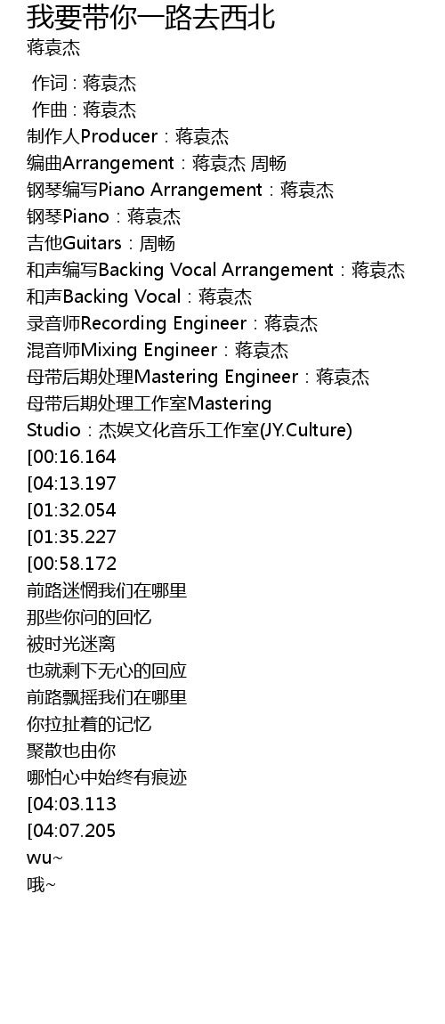 | [00:01.241][00:16.164][01:25.174][01:40.127][03:42.062] | 我要带你一路去西北 |