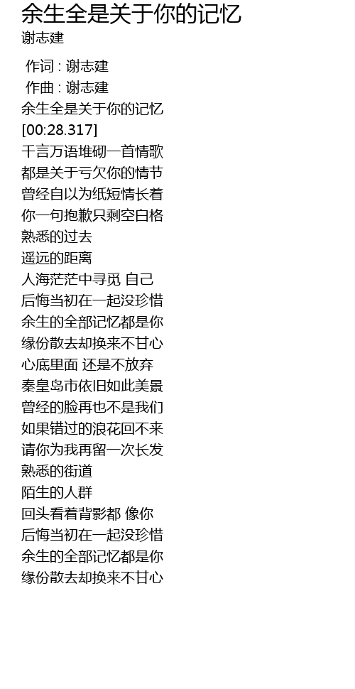 | [00:27.805] | yú shēng quán shì guān yú nǐ de jì yì |