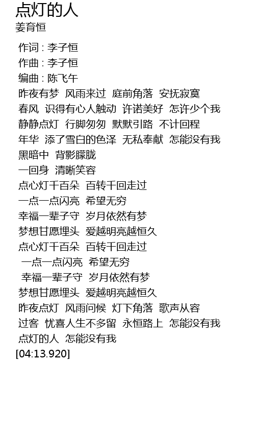 | [04:02.990] | 点灯的人 怎能没有我 |