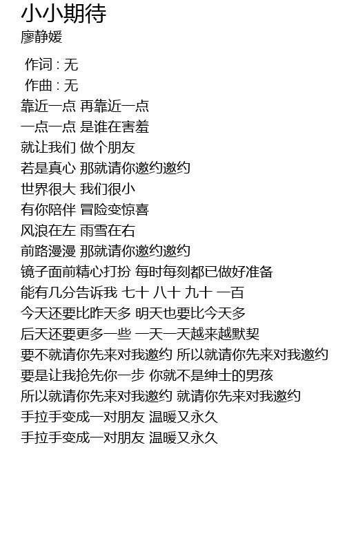 | [01:39.000] | shǒu lā shǒu biàn chéng yī duì péng yǒu wēn nuǎn yòu yǒng jiǔ |