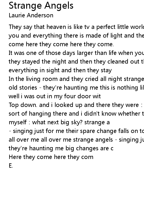 | In the living room and they cried all night strange angels - singing just for me old stories - they're haunting me this is nothing like i thought it would be. well i was out in my four door wit | |