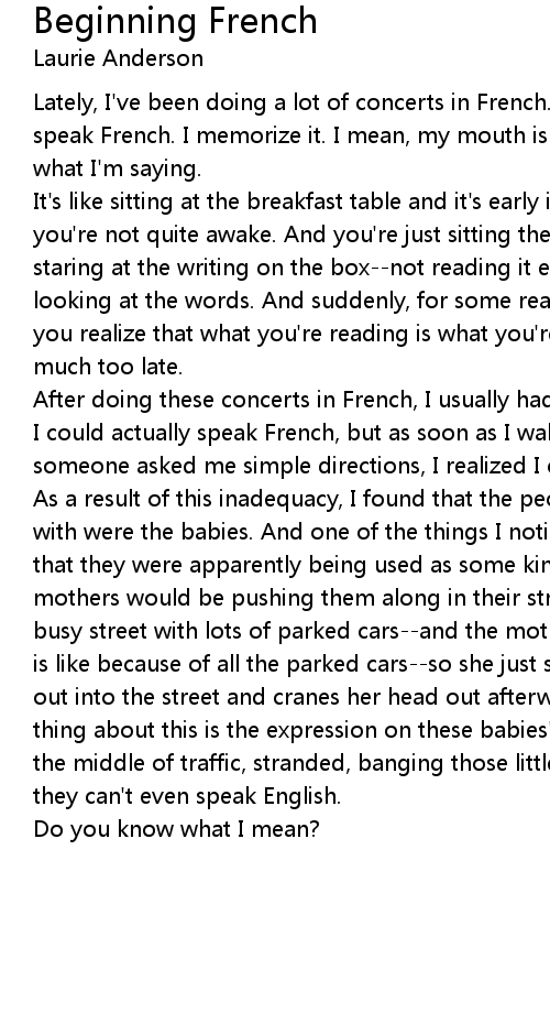 Lately, I've been doing a lot of concerts in French. Unfortunately, I don't speak French. I memorize it. I mean, my mouth is moving but I don't understand what I'm saying. |