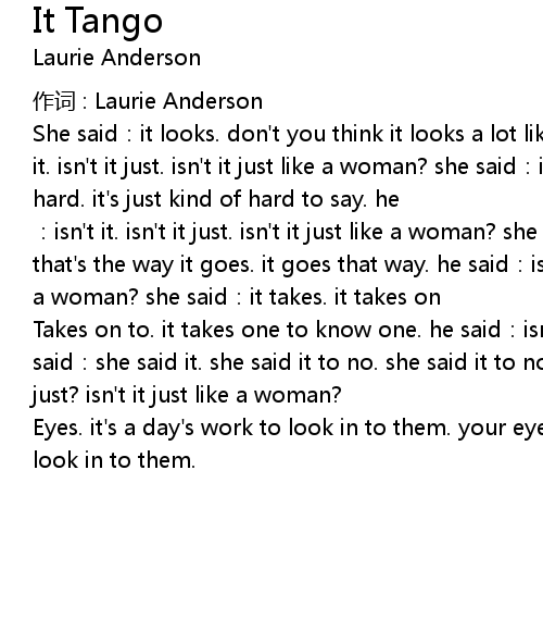 | Takes on to. it takes one to know one. he said:isn't it just like a woman? she said:she said it. she said it to no. she said it to no one. isn't it. isn't it just? isn't it just like a woman? | |