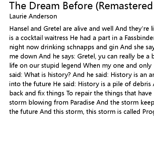 Hansel and Gretel are alive and well And they're living in Berlin She is a cocktail waitress He had a part in a Fassbinder film And they sit around at night now drinking schnapps and gin And she says: Hansel, you're really bringing me down And he says: Gretel, yu can really be a bitch He says: I've wated my life on our stupid legend When my one and only love was the wicked witch. She said: What is history? And he said: History is an angel being blown backwards into the future He said: History is a pile of debris And the angel wants to go back and fix things To repair the things that have been broken But there is a storm blowing from Paradise And the storm keeps blowing the angel backwards into the future And this storm, this storm is called Progress |