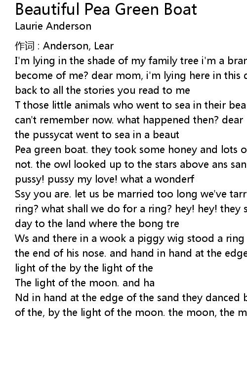| T those little animals who went to sea in their beautiful pea green boat. but i can' t remember now. what happened then? dear mom, how does it end? the owl and the pussycat went to sea in a beaut | |