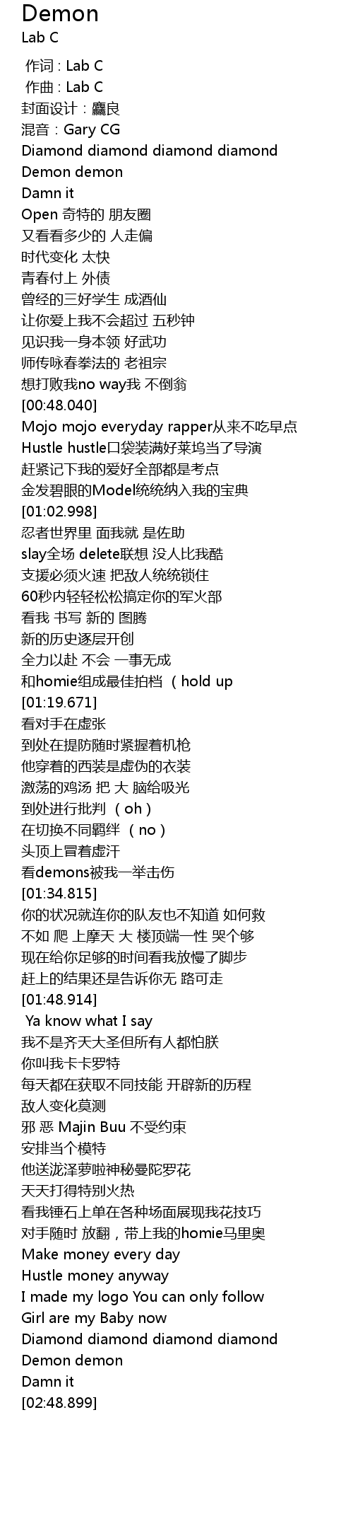 | [00:48.761] | Mojo mojo everyday rapper cong lai bu chi zao dian |