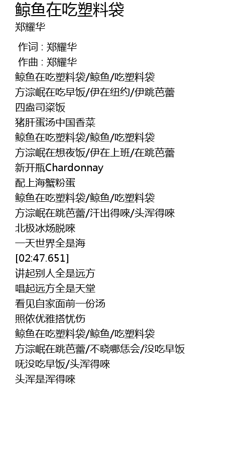| [02:11.003] | 鲸鱼在吃塑料袋/鲸鱼/吃塑料袋 |