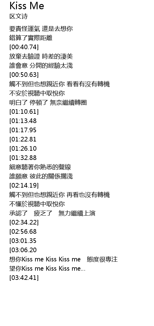 | [03:16.37][02:56.68] | 想你Kiss me Kiss Kiss me 態度很專注 |