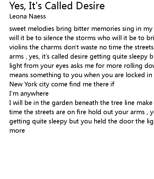sweet melodies bring bitter memories sing in my ear and drown out my heart who will it be to silence the storms who will it be to bring on the organs the violins the charms don't waste no time the streets are on fire hold out your arms , yes, it's called desire getting quite sleepy but you held the door the light from your eyes asks me for more rolling down hills and climbing up trees means something to you when you are locked in |