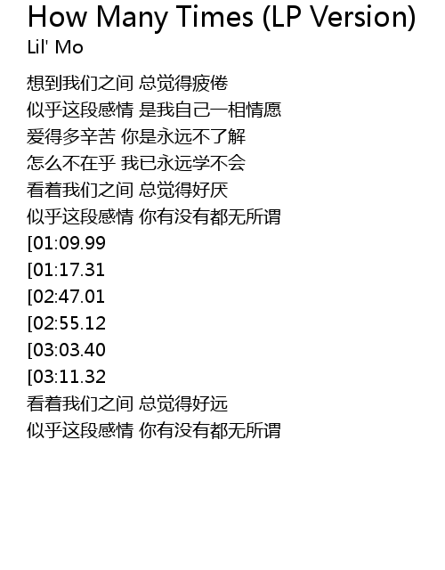 | [03:33.94][02:47.01][01:26.98] | 几滴眼泪 才能代表一次伤悲 |